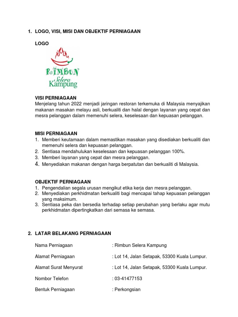 Contoh Visi Misi Dan Objektif Perniagaan Restoran