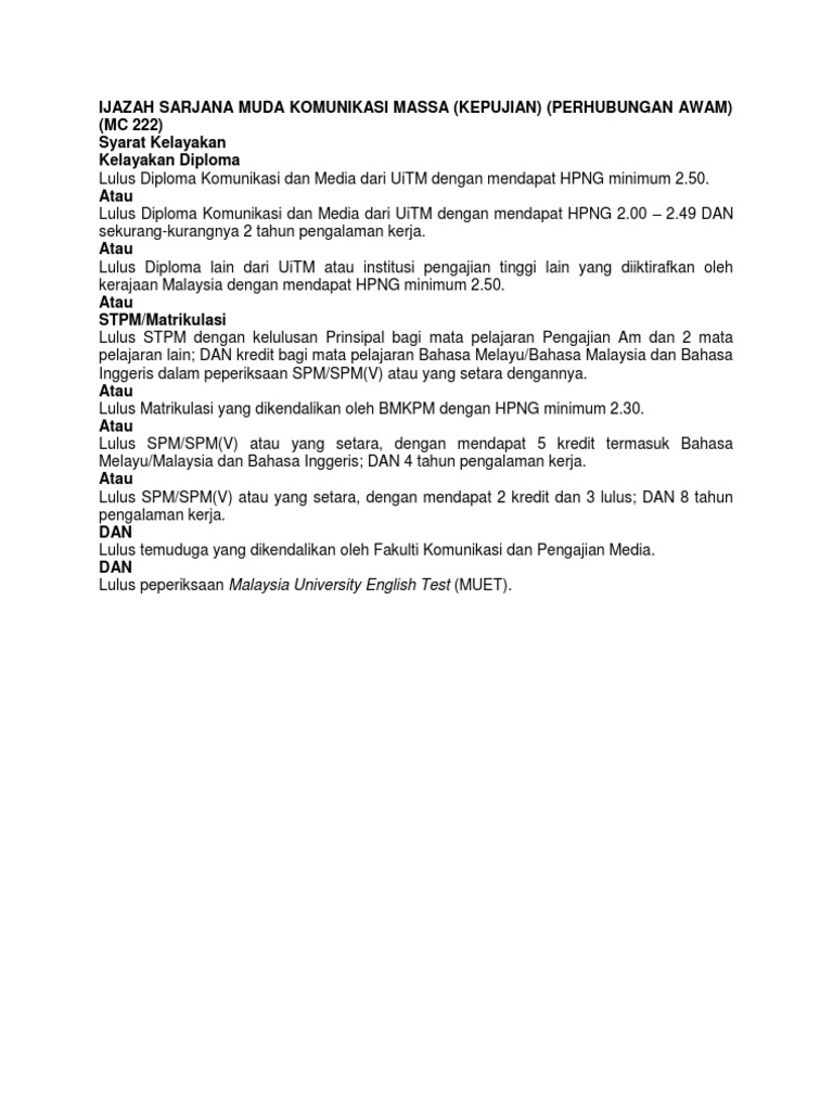 Ijazah Sarjana Muda Komunikasi Massa Kepujian Perhubungan Awam Mc 222 Syarat Kelayakan Kelayakan Diploma Atau